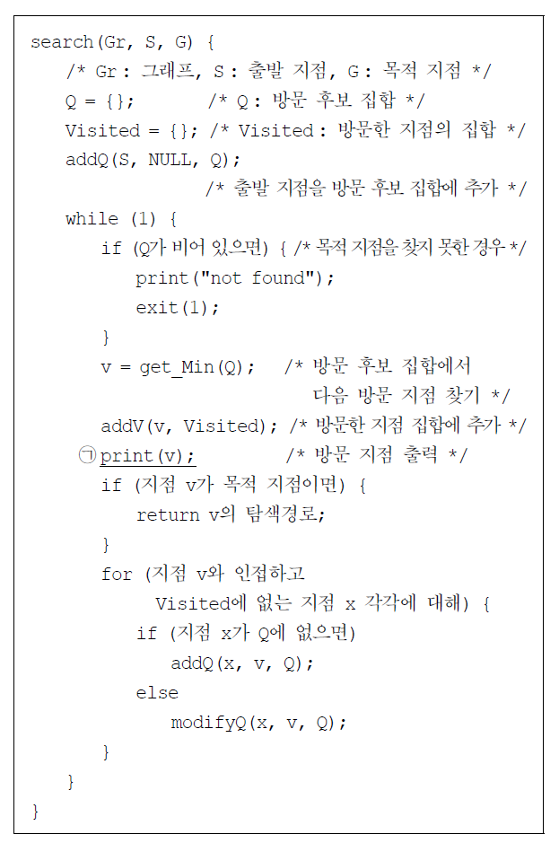 11. 다음은 등산 과정에서 정상을 향해 가는 길을 찾고자 하는 C 유사 알고리즘이다. 이 알고리즘은 평가함수를 이용하여 길을 찾는다. 을 고려하여 에 따라 서술하시오. [4점] ◦ 주어진 그래프 Gr로 알고리즘을 수행할 때 밑줄 친 ㉠의 출력 결과를 순서대로 쓸 것.◦ 주어진 그래프 Gr로 알고리즘을 수행할 때 밑줄 친 ㉠의 출력 결과 가운데 출력 시점의 평가함수 f 값이 최대인 지점과 그 값을 쓸 것. 시간내에 못푼다. 다시 나오면 다른 문제 다 풀고 손댈것 .